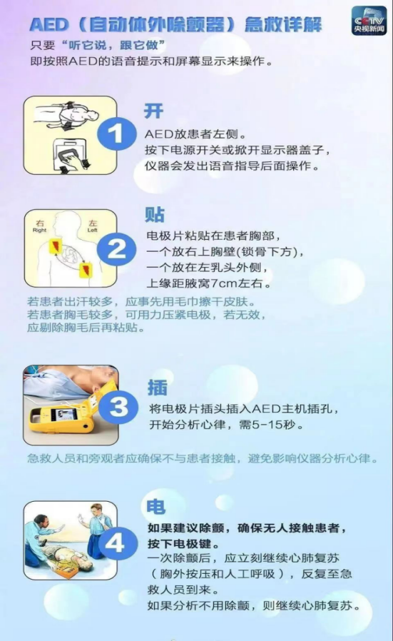 在公共场合当有人突然晕倒、没有意识需要抢救时,如在“黄金4-6分钟”内及时救治,病人的救活率在60%以上,利用自动体外除颤器( AED )对患者进行除颤和心肺复苏(CPR),是最有效制止猝死的办法。除颤每推迟1分钟,存活率就降低7%-10%。CPR 与 AED 的早期有效配合使用,是抢救心跳呼吸骤停病人 最有效的手段。