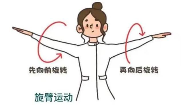 耸肩、旋臂运动:耸肩运动:患者呈站立位,进行耸肩运动,术侧肩部尽可能用力上提,保持5-10s后回到起始部位,幅度逐渐加大。旋臂运动:患者站立,上肢自然下垂,术肢以肩为轴,前旋或后旋,10-15分钟/次,2-3次/天。