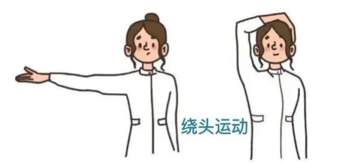 2.绕头运动:患者站立位,术肢抬起从同侧耳部逐渐摸向对侧耳后。5-10分钟,1-2次/天。