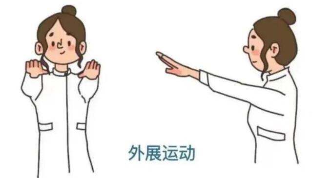 外展运动:上肢往两侧伸展,回收再打开,逐渐过渡到与肩关节持平,10-15分钟/次,2-3次/天。