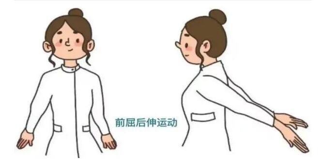 前屈后伸运动,站立将患肢前伸和后摆。逐渐增加伸展的幅度,不超过45°,10-15分钟/次,2-3次/天。