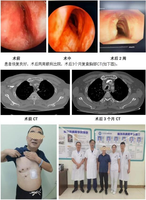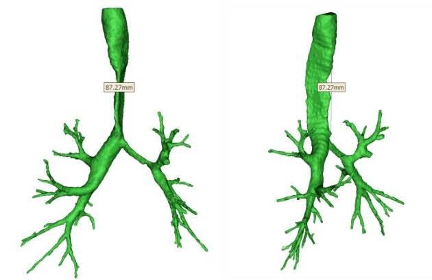 患者柴先生(化名)今年50岁,10年前因气管内膜结核导致气管狭窄,曾短暂放过气管内支架,后因肉芽肿再次堵塞气道等并发症而取出支架。此后10年期间总是活动后胸闷、气短,但尚能工作、生活。近半年,病人反复肺感染,痰液堵塞,因呼吸困难,肺炎,窒息多次住院,一度窒息危及生命。为求诊治,柴先生慕名来到哈医大四院胸外科就诊,气管镜及三维可见气管严重软化狭窄,变形,长度达8.7cm(气管全长10cm),左主支气管狭窄(如下图)。