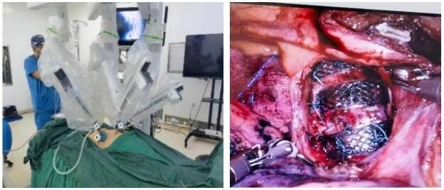 在胸外科徐进志主任的带领下,团队研究讨论了各种治疗方案,最终决定使用气管外固定技术先行纠正主气道的畸形狭窄。经过充分的术前论证及准备,在麻醉科王颖主任的配合下,由胸外科徐进志主任、韩敬泉副主任、闫曦主治医生,通过机器人微创入路,在上腔静脉内缘、升主动脉内缘、头臂干动脉下缘以及右肺动脉所构成的四边形区域内完成气管前表面(第二软骨环至隆突)的全部游离,完全暴露气管软骨,但保留膜部侧血液供应,置入自行设计的C型镍钛合金覆膜气管外固定支架,通过5-6针非可吸收线穿透气管软骨,将外固定支架牢牢固定于气管软骨侧(如下图)。