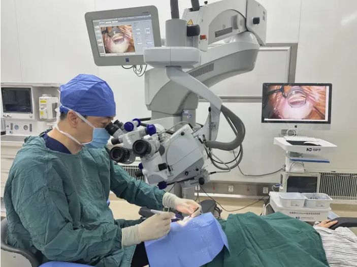 该患者眼科门诊收入院,术前减低眼压,王峰教授多方考虑之后采用超声乳化白内障摘除浑浊膨胀晶体,之后植入透明人工晶体,同时通过透明角膜入路,术中房角镜辅助下将两枚最大直径仅330μm的小梁网微支架准确植入到schlemm 管,从而减少房水流出阻力降低眼压。这是王峰主任完成的国产自主研发的“MicroCOGO®小梁网微支架引流系统”东北地区的首例手术。“MicroCOGO®小梁网微支架引流系统”是微创内引流手术,具有安全性、有效性及恢复快等特点,显著降低传统青光眼手术的风险,且减少长期用药的经济负担等,适用于降低轻度至中度开角型青光眼合并白内障患者的治疗。哈医大四院眼科王峰主任团队,率先开展青光眼微创手术,用精湛的技术为我省青光眼患者带来了希望。