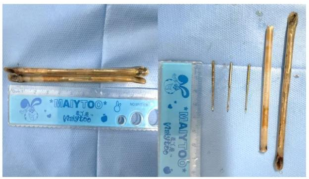 经过积极完善术前准备,在麻醉医师的协助下,王立国教授为患者实施全麻下内镜检查及镜下异物取出术。内镜下见异物斜跨在十二指肠降段,异物两端尖锐,十二指肠黏膜受到损伤,有穿破肠道、大出血等风险。术中,王立国教授凭借娴熟的技术、精确操作,有效避免了对患者的黏膜造成二次损伤,应用异物钳及圈套器等装置反复尝试,最终取出2根长约12cm的异物,剖开塑料胶管,见6根钢针锋利无比。术中、术后患者无不适,安返病房。