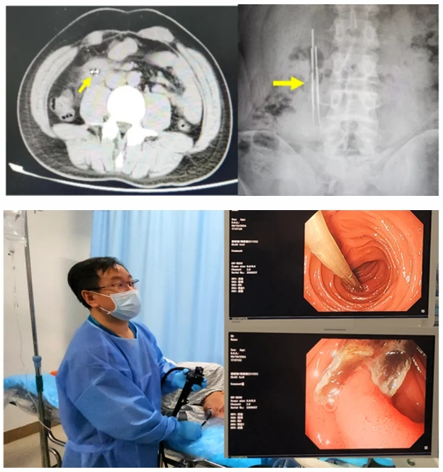 患者李先生(化名)误吞食六根钢针,辗转求医至哈医大四院,经检查腹部CT发现十二指肠球部高密度,立位腹部平片:脊柱右侧多根金属针影;双侧膈下未见游离气体。考虑异物在患者体内的位置已经进入十二指肠,稍有不慎就可能进入小肠甚至穿孔,情况十分紧急,需要立即取出,接诊医生紧急联系消化内科王立国教授。