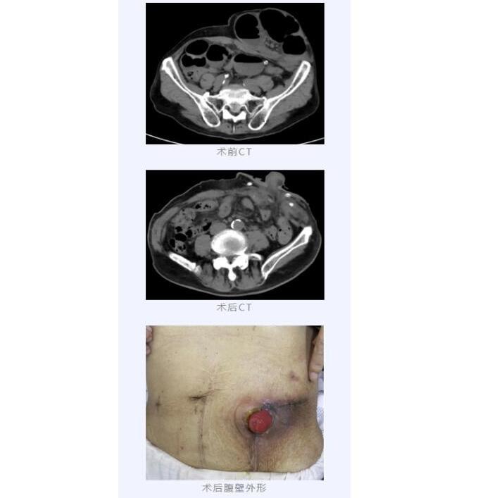 79岁老年男性患者,既往外院行直肠癌根治术(Miles),术后5年出现造瘘口旁疝,造瘘口周围有肠管突出形成肿块,近日随着肿块逐渐增大,平卧时不能还纳回腹腔,并出现肠梗阻症状(造瘘口停止排气排便,并伴有恶心呕吐),因病情复杂辗转多家医院都未能手术。患者慕名找到刘昶教授,入院后科室团队制定治疗方案,置入肠梗阻导管减压,肠管的扩张和水肿得到明显改善后,为下一步手术创造了条件。经过术前评估,团队为患者行腹腔镜下造瘘口旁疝修补手术,术中发现造瘘口周围小肠因反复摩擦形成粘连伴明显狭窄,肠内容物通过困难,因此术中行小肠侧侧吻合术越过小肠狭窄段,考虑到患者肠梗阻以及小肠吻合造成腹腔感染等因素,术中应用生物补片进行造瘘口修补,极大地降低感染风险,手术过程顺利,出血仅20ml。术后第2日患者即离床活动,第5日经造瘘口排气排便,进流食,第7日复查腹部CT显示恢复良好,患者康复出院。