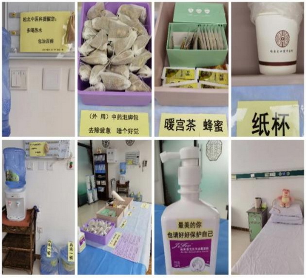 松北中医科为预检分诊护理团队提供住宿,并为预检分诊伙伴们准备泡脚中药包、蜂蜜、茶包等生活用品,使护士们心里倍感温暖。