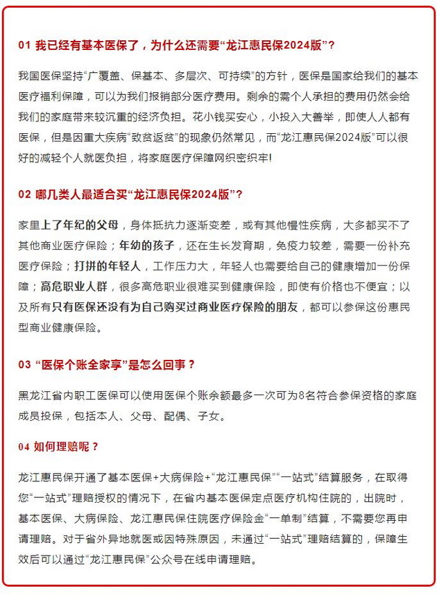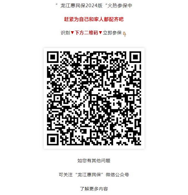 我们时常会看到患重病众筹医药费的真实故事,也大多会给予几十上百元不等的爱心捐助,但求人不如求己。衷心希望广大基本医保参保人,尽快为自己和家人办理“龙江惠民保2024版”,一年仅需150元即享最高400万医疗保障,为自己和家人撑起健康保护伞。