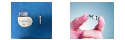 左侧为传统起搏器 右侧为无导线起搏器(micra) micra只有胶囊大小