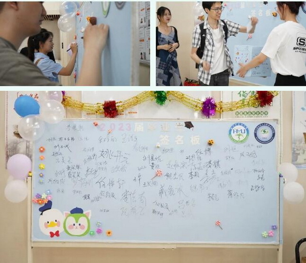 毕业生们在学院精心准备的签名板上签下自己的名字留念,并抽取由学弟学妹们赠送的毕业祝福语。