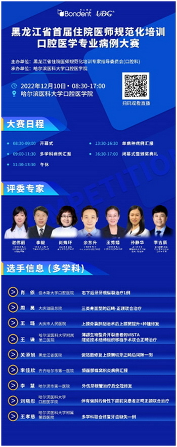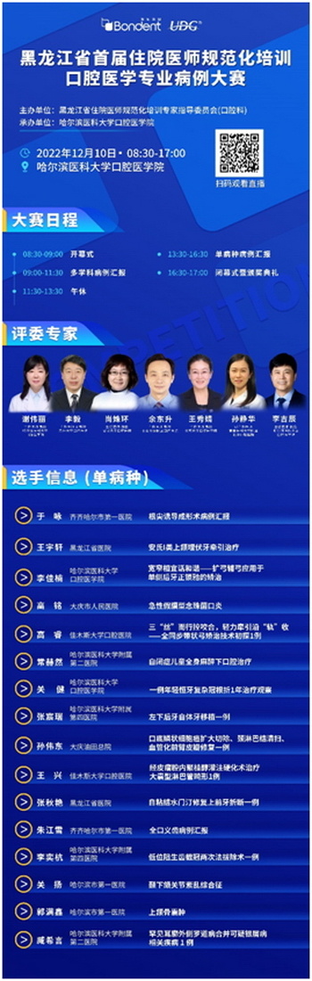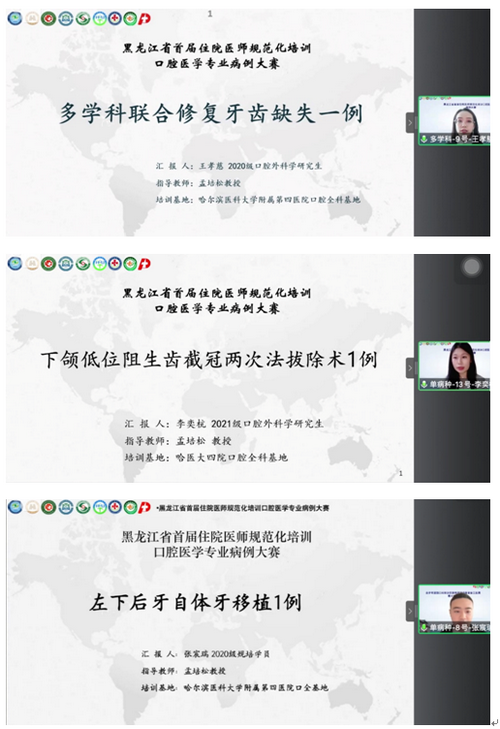 2022年12月10日,由黑龙江省住院医师规范化培训专家指导委员会主办,哈尔滨医科大学口腔医学院承办的“黑龙江省首届住院医师规范化培训口腔医学专业病例大赛”圆满落下帷幕。经过紧张激烈的角逐,我院口腔全科基地2020级硕士研究生王孝慈同学在多学科项目中获得二等奖的优异成绩;2021级硕士研究生李奕杭同学、2020级规培学员张宸瑞同学在单病种项目中分别获得二、三等奖的优异成绩。