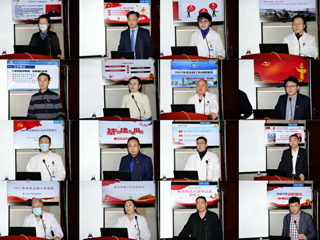 在述职考核评议会上,来自临床、医技、行政后勤等科室的65名党支部书记依次以PPT形式进行了述职汇报。述职中,各支部书记坚持以习近平新时代中国特色社会主义思想为指导,深入学习贯彻落实党的十九届六中全会精神,紧密结合工作实际,分别就党建引领和党员带头作用情况;凝心聚力、积极抗疫、弘扬正气、服务群众方面情况;意识形态、党史学习教育、党风廉政方面情况;支部工作突出亮点等方面做了全面汇报。