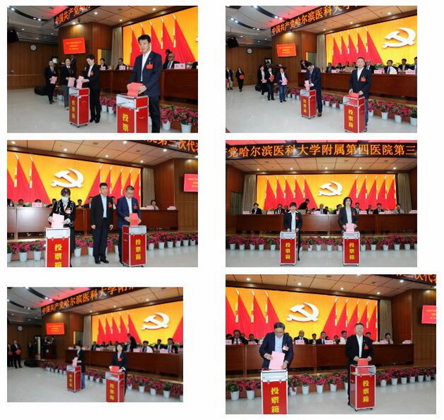 总监票人向大会报告了选举结果,郭松宣读了中共哈医大四院第三届委员会和新一届纪律检查委员会当选委员名单。郭松、刘明、赵羽、王国年、吴江、孙心海、高育红、岳凤莲、徐伟当选为党委委员,岳凤莲、孙贺征、郝靖坤、金雁、张欣多、马晓南、张晓亮当选为纪委委员。大会通过了党委工作报告,纪委工作报告,党费收缴、使用、管理情况的审查报告。
