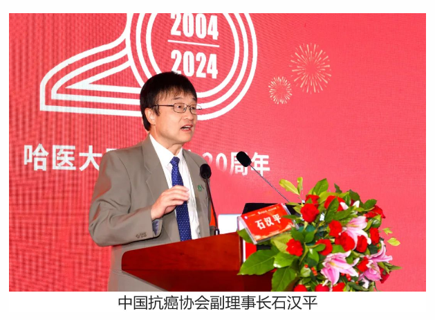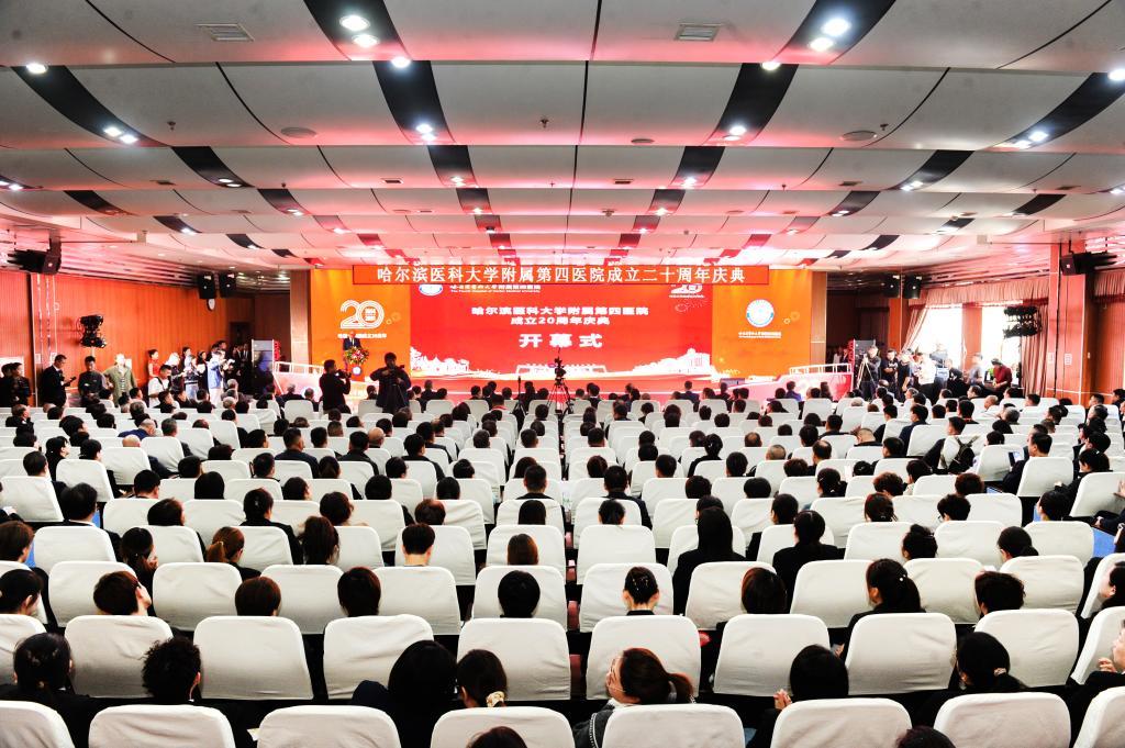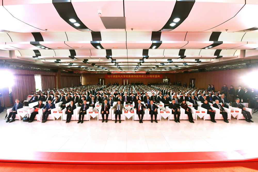 中国工程院院士、哈尔滨医科大学原校长杨宝峰,中国工程院院士、哈尔滨医科大学党委书记张学,哈尔滨医科大学校长季勇致辞。中国抗癌协会副理事长石汉平,新华社黑龙江分社副社长王淮志,黑龙江省药品监督管理局副局长王晓刚,黑龙江省医师协会会长李剑锋,四川大学华西医院医院管理研究所主任王晓冬,吉林大学第一医院副院长于家傲,复旦大学附属华山医院教授林建华,中国科技出版传媒股份有限公司策划编辑李植,北京大学肿瘤医院教授唐丽丽,中国医学科学院肿瘤医院教授田艳涛等领导专家,各兄弟医院领导,以及省、市相关单位领导和社会各界嘉宾,医院历任领导、老专家,医院全体领导班子成员、职工代表齐聚一堂,共同庆祝医院二十华诞。