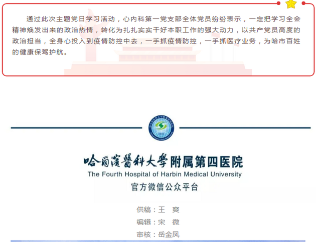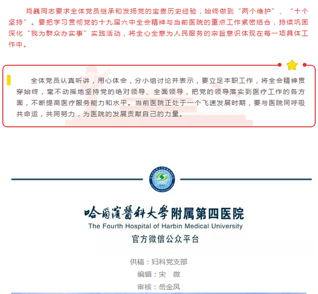 为全面贯彻落实习近平新时代中国特色社会主义思想和党的十九届六中全会精神,落实新时代党的组织路线,扎实推进党支部标准化、规范化建设,持续推进哈医大四院年度党建重点任务落实,以高质量党建引领高质量发展,按照学校党委统一部署,12月25日,哈医大四院召开2021年度基层党支部书记述职评议大会。按照疫情防控要求哈医大四院院领导班子、党支部书记通过“线上+线下”相结合的方式参加会议,述职人员分时段,分批次述职,会...