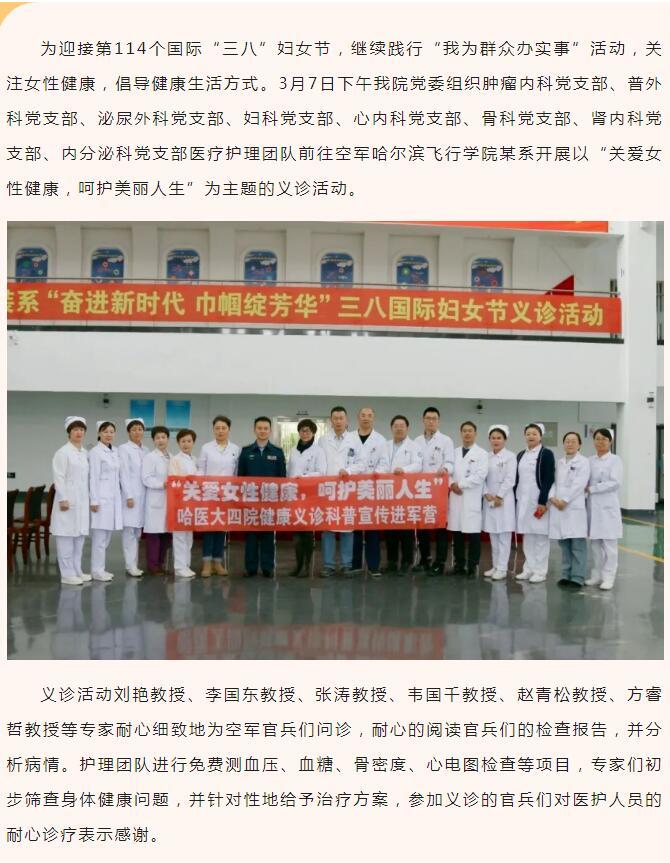为深入学习贯彻习近平新时代中国特色社会主义思想,全面贯彻落实党的二十大精神,持续深化学校党委“红医芳华”党建示范品牌建设。6月27日至29日,哈医大四院党委副书记兼工会主席赵羽带领心内科、超声科、普外科、肿瘤内科、消化内科、呼吸内科、胸外科、病案室等12人,赴大兴安岭地区人民医院开展庆祝建党103周年承红医精神 “红心向党 医暖北疆”主题党日活动。主题党日当天,专家们为当地百姓进行爱心义诊、健康科普讲座、...