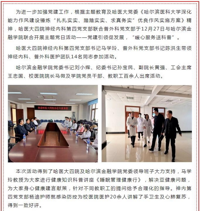 为切实畅通信息沟通渠道,及时回应师生诉求,解决事关师生群众切身利益的急难愁盼问题,打造多元化、立体化学校基层党建质量工程,2月29日下午,哈尔滨医科大学副校长高彦辉到哈医大四院心内科第一党支部联系点指导工作,并参加党支部的政治理论学习会。副校长高彦辉到心内科第一党支部指导工作支部大会上,副校长高彦辉听取了心内科支部书记支继新同志的工作汇报,并与支部党员进行了座谈交流。党支部书记支继新讲授党课随后,...