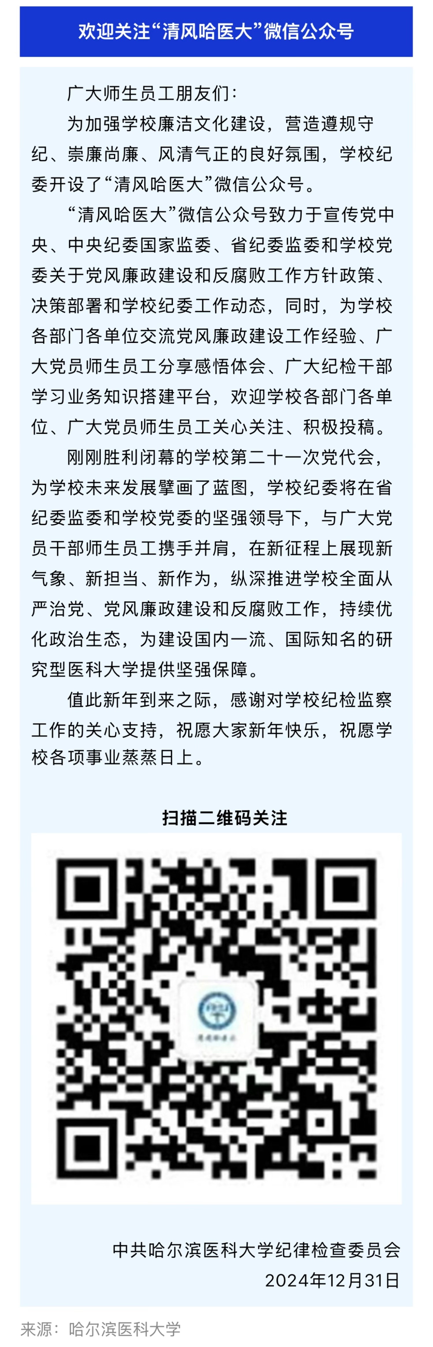 哈医大四院积极推广使用“龙江医廉码” 发挥社会监督作用 为进一步加强医院行风建设,提升医疗服务质量,哈医大四院积极落实并全面推广使用“龙江医廉码”,充分发挥社会监督对医院工作的促进作用,不...
